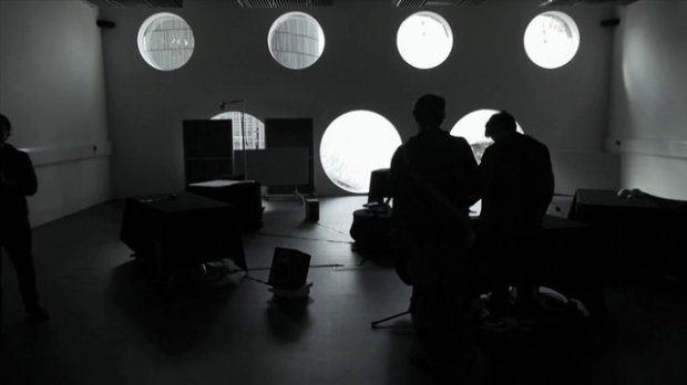Arranged in a circle facing inwards, members of the audience are invited to explore, experiment and experience improvising music with others around them. The instruments are all digital and networked together, allowing them to subtly align in terms of harmony and tempo. Projected onto the ground between them is a visualisation showing musical connections between participants that the installation has detected.
