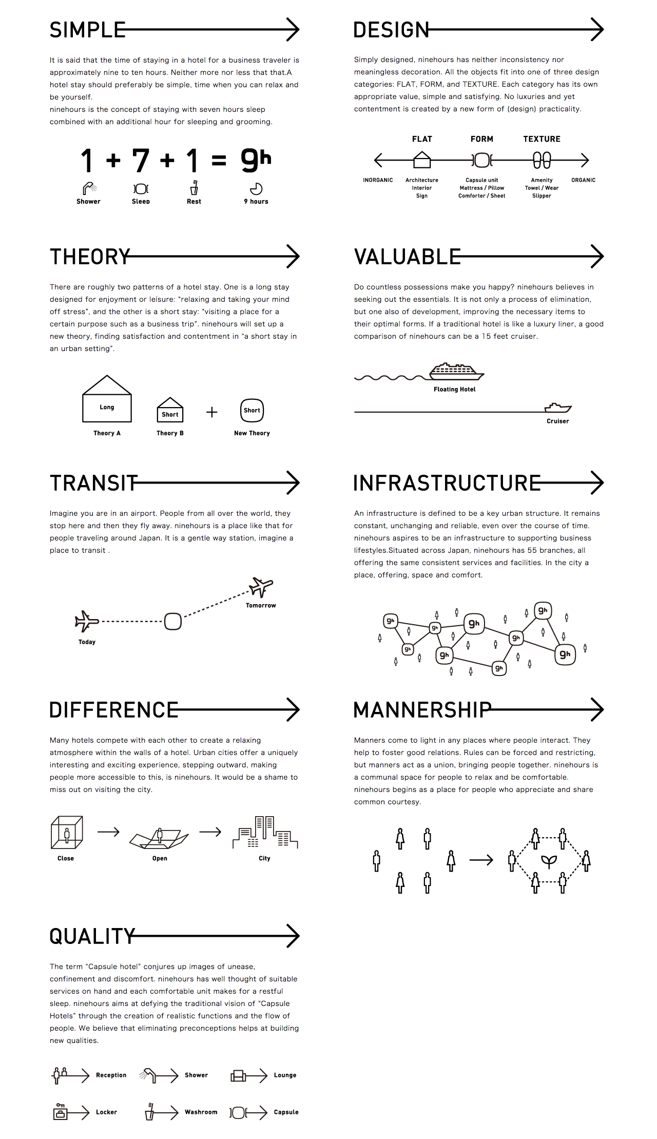 ‘9h / nine hours hotel at Narita Airport is a tool designed to offer more freedom to guests from around the world. Simply designed, ninehours has neither inconsistency nor meaningless decoration. All the objects fit into one of three design categories: FLAT, FORM, and TEXTURE. Each category has its own appropriate value, simple and satisfying. No luxuries and yet contentment is created by a new form of (design) practicality.’ —via source