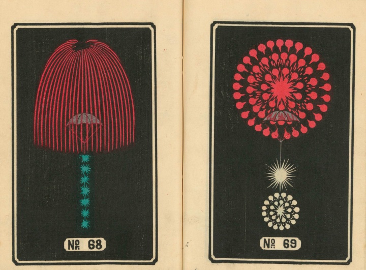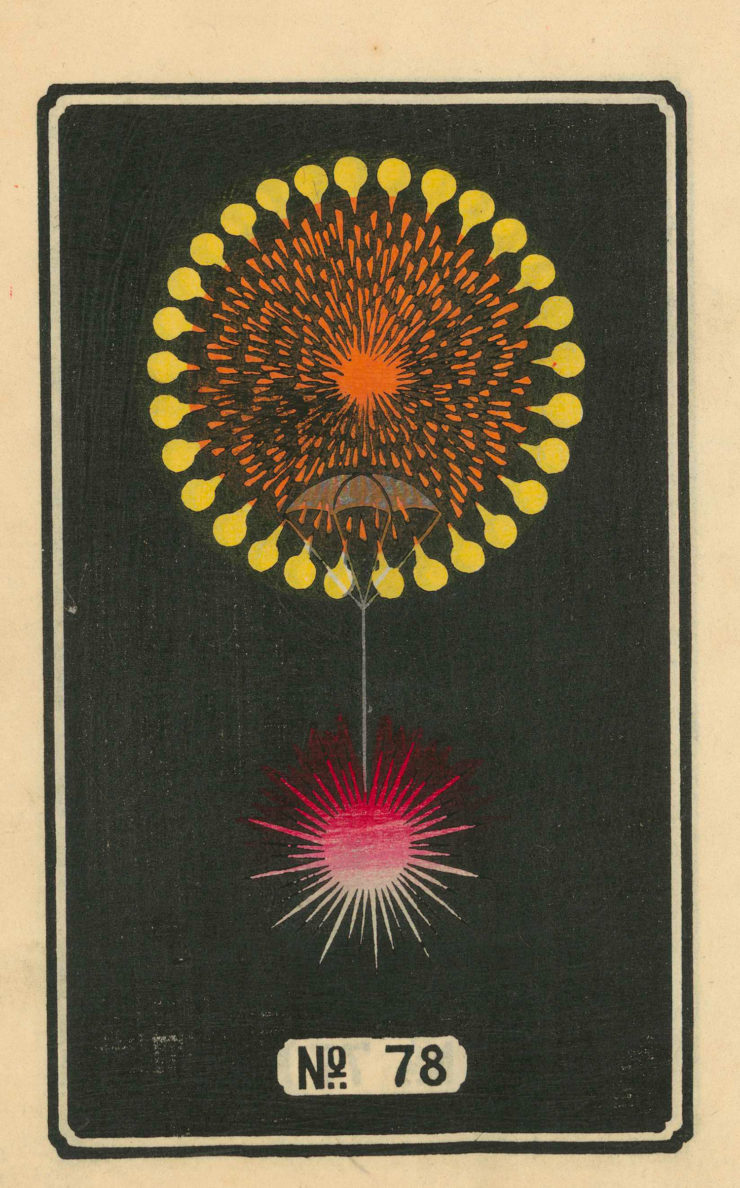 In the early 20th-century English fireworks company C.R. Brock and Company (now known as Brocks Fireworks) published colorful catalogs displaying designs from Japanese companies such as Hirayama Fireworks and Yokoi Fireworks. Six catalogs of diverse pyrotechnic diagrams have been digitized and made available for download thanks to the city of Yokohama’s public library.