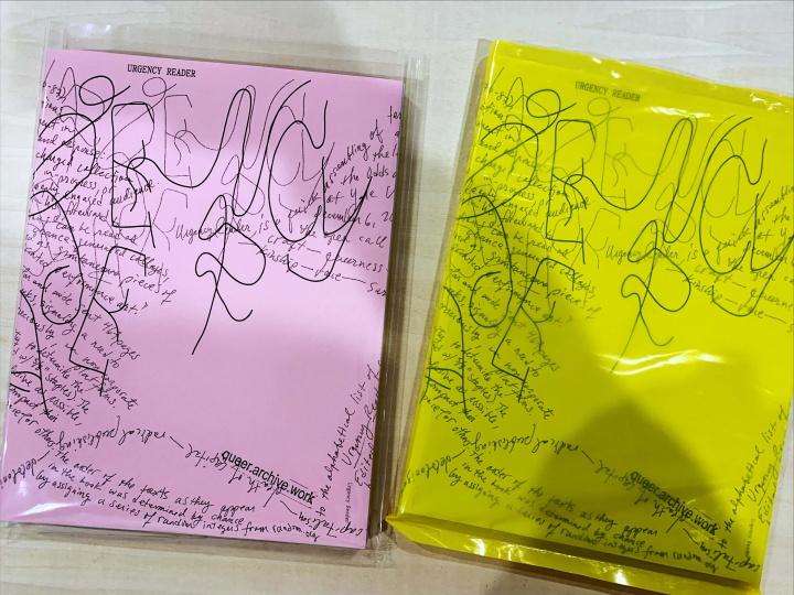 Urgency Reader 252 pages + cover Risograph printed book with black ink on Domtar Earthchoice paper Hand-bound with 5/8 inch staples and partial wrap-around cover adhered to back page Edition: 110 copies