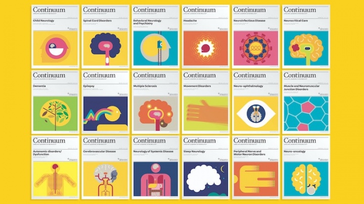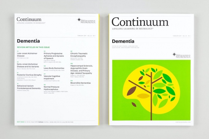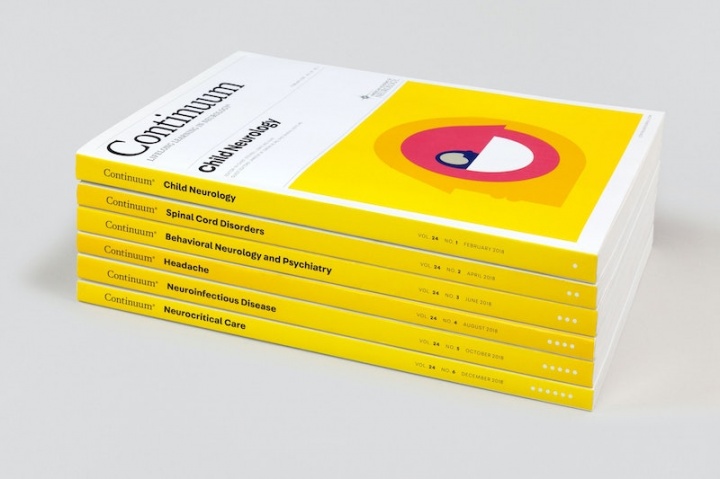 Pentagram has released its redesign of Continuum, the AAN’s bimonthly continuing education journal. As the firm writes, “Continuum is the most academic of the AAN publications, dense with information. The goal of the update, the first since its launch in 1993, was to make the editorial design more accessible, straightforward and visually appealing.” Color is a key part of the redesign as well; with its gold-orange hues, the magazine pays homage to the gold metallic tones that used to appear on its covers, and sections employ a color-coded organizational system.